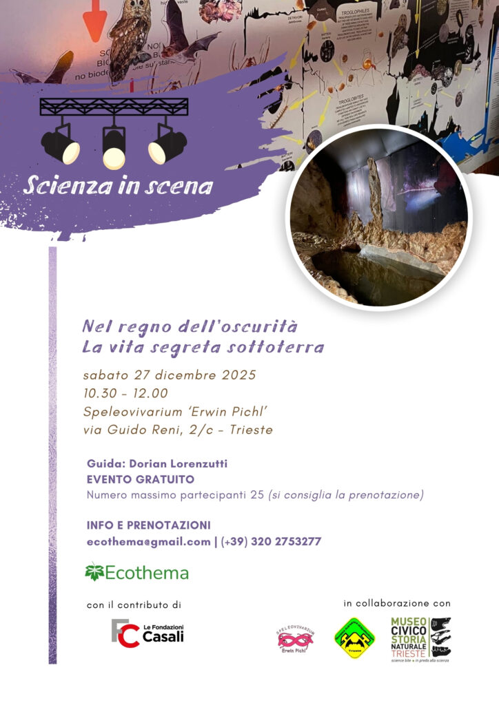 Un’esperienza immersiva nel mondo sotterraneo, là dove la luce non arriva e la vita ha imparato ad adattarsi in modi sorprendenti. Tra cunicoli e ambienti ipogei, i partecipanti scopriranno la fauna sotterranea del Carso triestino, le sue strategie di sopravvivenza e il delicato equilibrio degli ecosistemi nascosti sotto i nostri piedi.